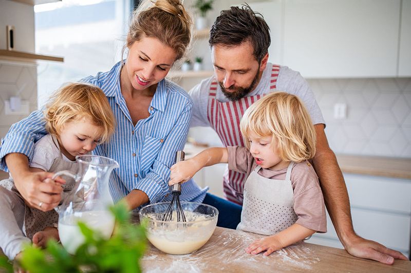 اگر بچهها سهمی در تهیه غذا داشته باشند، بیشتر ترغیب میشوند که آن را امتحان کنند. کارهای اساسی مانند اندازه گیری مواد اولیه، همزدن مواد در کاسه یا تهیه سالاد، همه از نقاط شروع بسیار خوبی هستند. هنگامی که آنها این کارهای ساده را انجام میدهند، میبینند که چگونه غذاهای کامل و سایر وعدههای غذایی کنار هم قرار میگیرند، و حتی با بزرگتر شدن آنها پیشنهاد برای تهیه وعدههای غذایی سالم خود را میدهند. پخت و پز با کودکان کم سن و سال گاهی به معنای پخت و پز کندتر و سادهتر است، اما نتیجهی آن ارزش دارد.